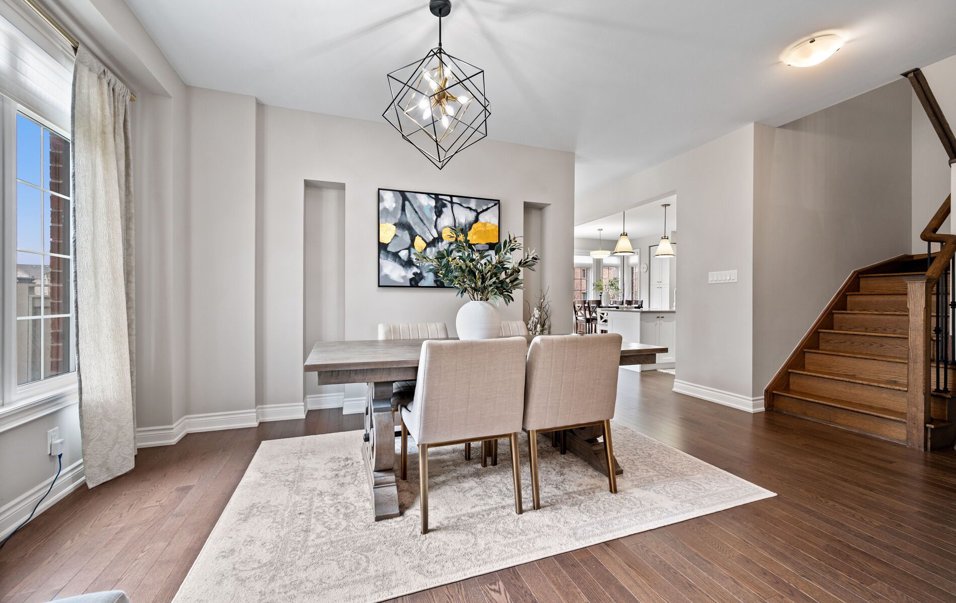 Inside, the home unfolds with intention. A welcoming foyer leads into a refined main level where each space connects seamlessly while maintaining its own identity. The living and dining areas are bright and inviting, anchored by large windows and clean architectural lines. The overall effect is one of balance, where openness meets comfort in a way that feels both elevated and livable.