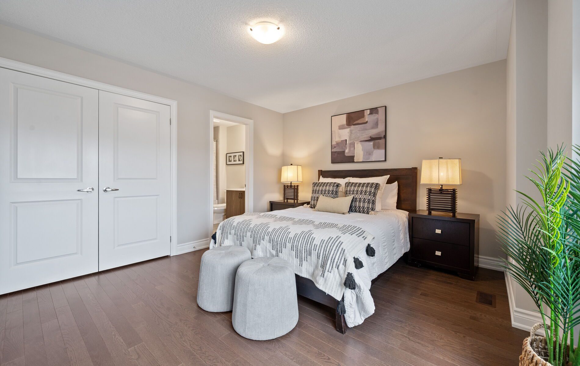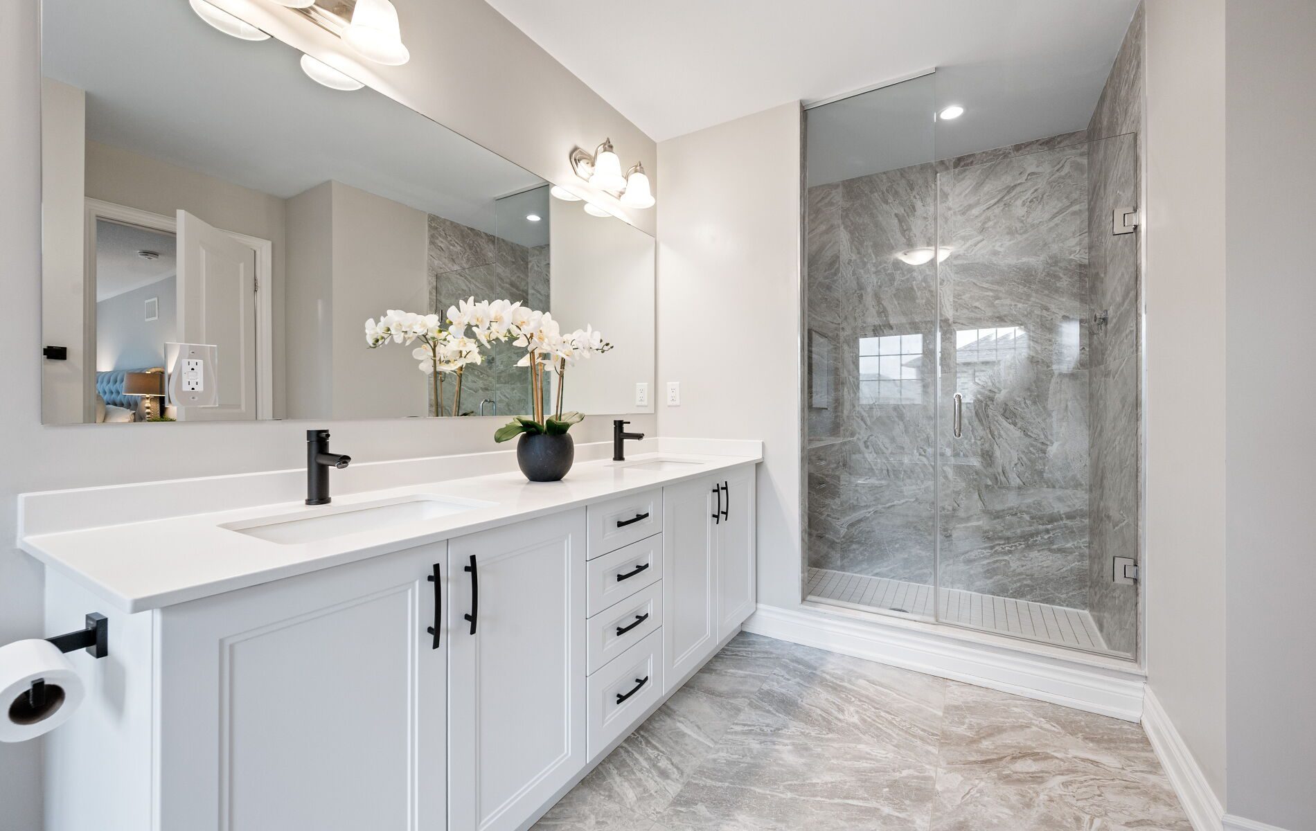 The second level is where the home truly distinguishes itself. Four well-proportioned bedrooms are complemented by an exceptional layout that ensures each room has direct access to a bathroom. The primary suite is both spacious and refined, featuring a spa-inspired ensuite with a soaker tub, an oversized glass shower, and a calming atmosphere designed for relaxation.